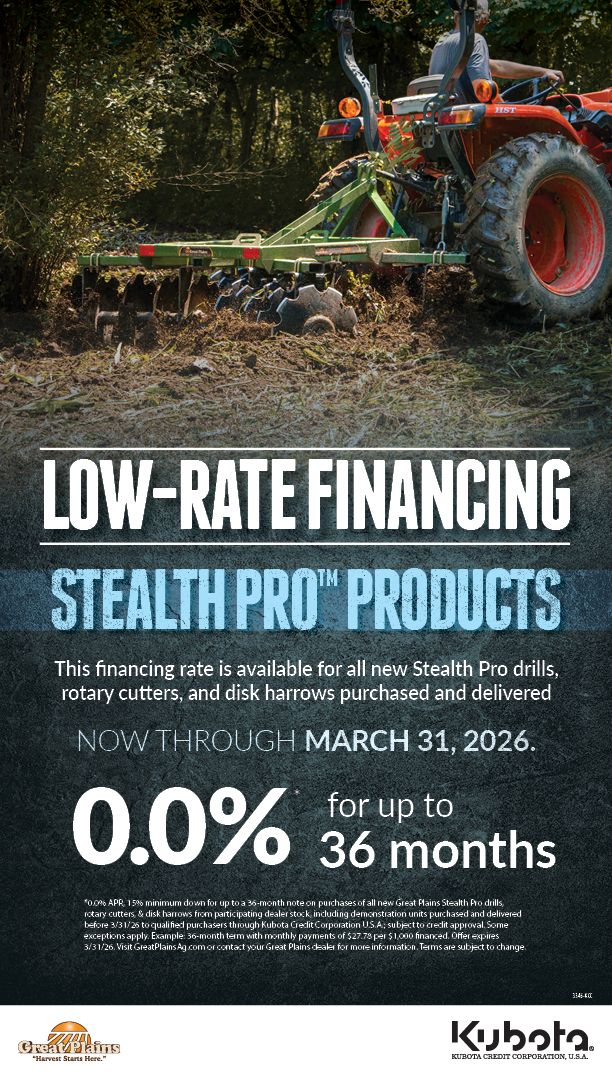 *0.0% APR, 15% minimum down for up to a 36-month note on purchases of all new Great Plains Stealth Pro drills,rotary cutters, & disk harrows from participating dealer stock, including demonstration units purchased and deliveredbefore 3/31/26 to qualified purchasers through Kubota Credit Corporation U.S.A.; subject to credit approval. Someexceptions apply. Example: 36-month term with monthly payments of $27.78 per $1,000 financed. Offer expires3/31/26. Visit GreatPlainsAg.com or contact your Great Plains dealer for more information. Terms are subject to change.